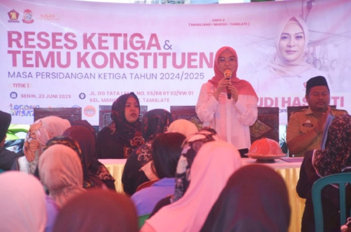 Makassar | Anggota DPRD Kota Makassar dari Fraksi Gerindra, Budi Hastuti, menggelar reses masa persidangan ketiga tahun sidang 2024/2025 di Kelurahan Mangasa, Kecamatan Tamalate, Senin (23/6/2025). Dalam pertemuan tersebut, warga menyampaikan sejumlah keluhan, terutama terkait distribusi bantuan sosial yang dinilai belum merata serta kesulitan mengurus KIS dan BPJS.